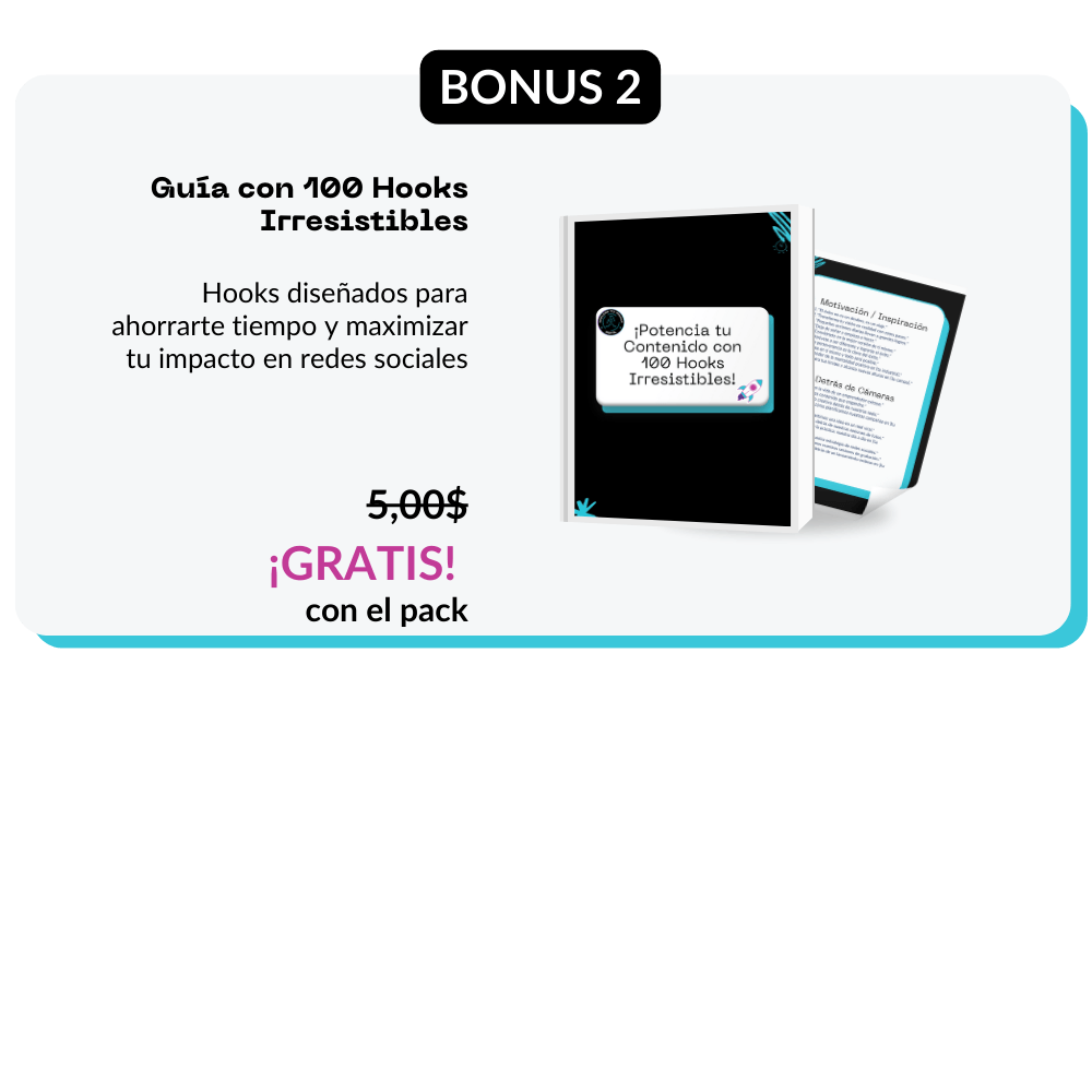 ☑️ Guía con 100 Hooks Irresistibles para ahorrarte tiempo y maximizar tu impacto en redes sociales. Valorado en 15$. Gratis con el pack